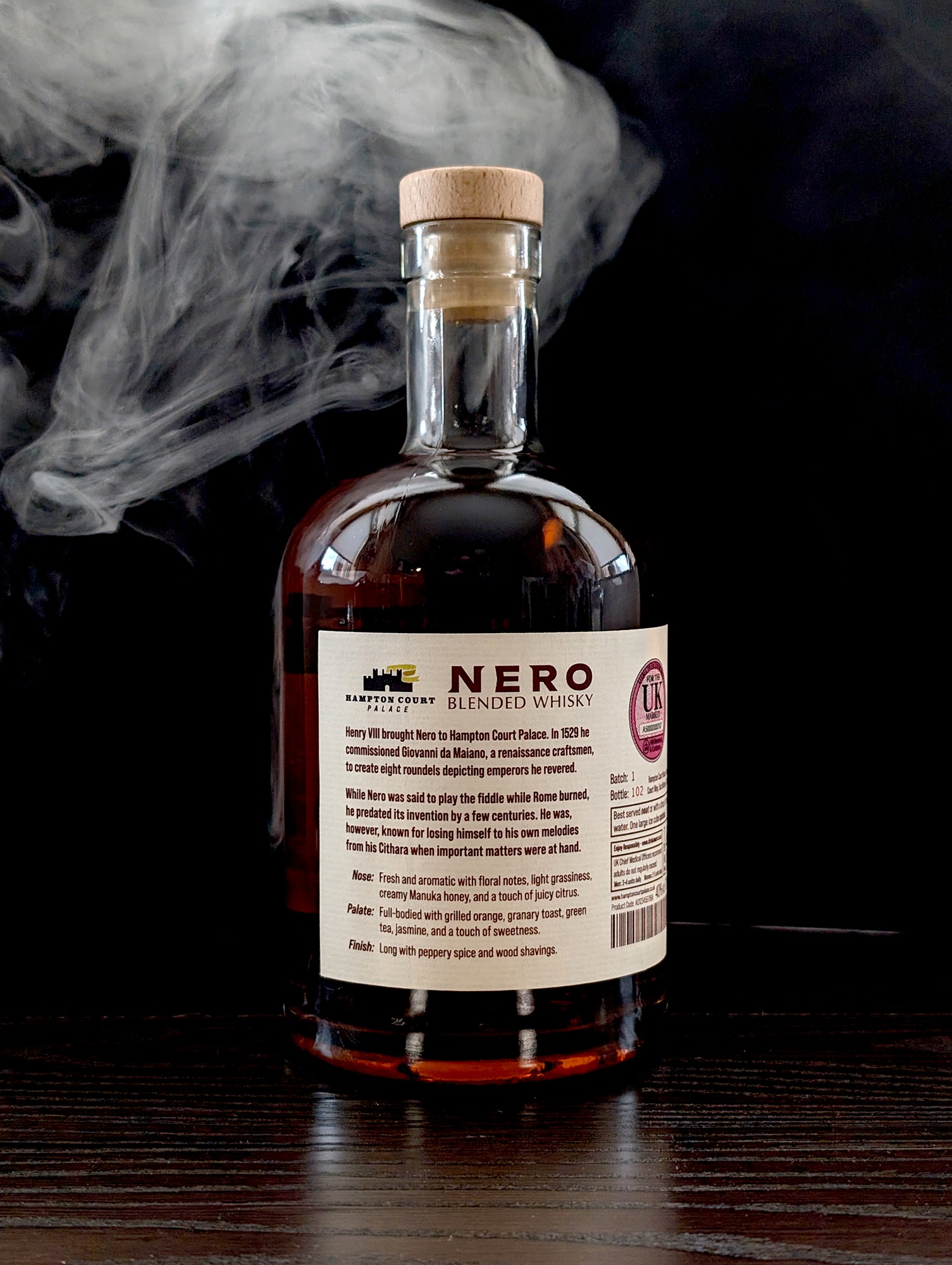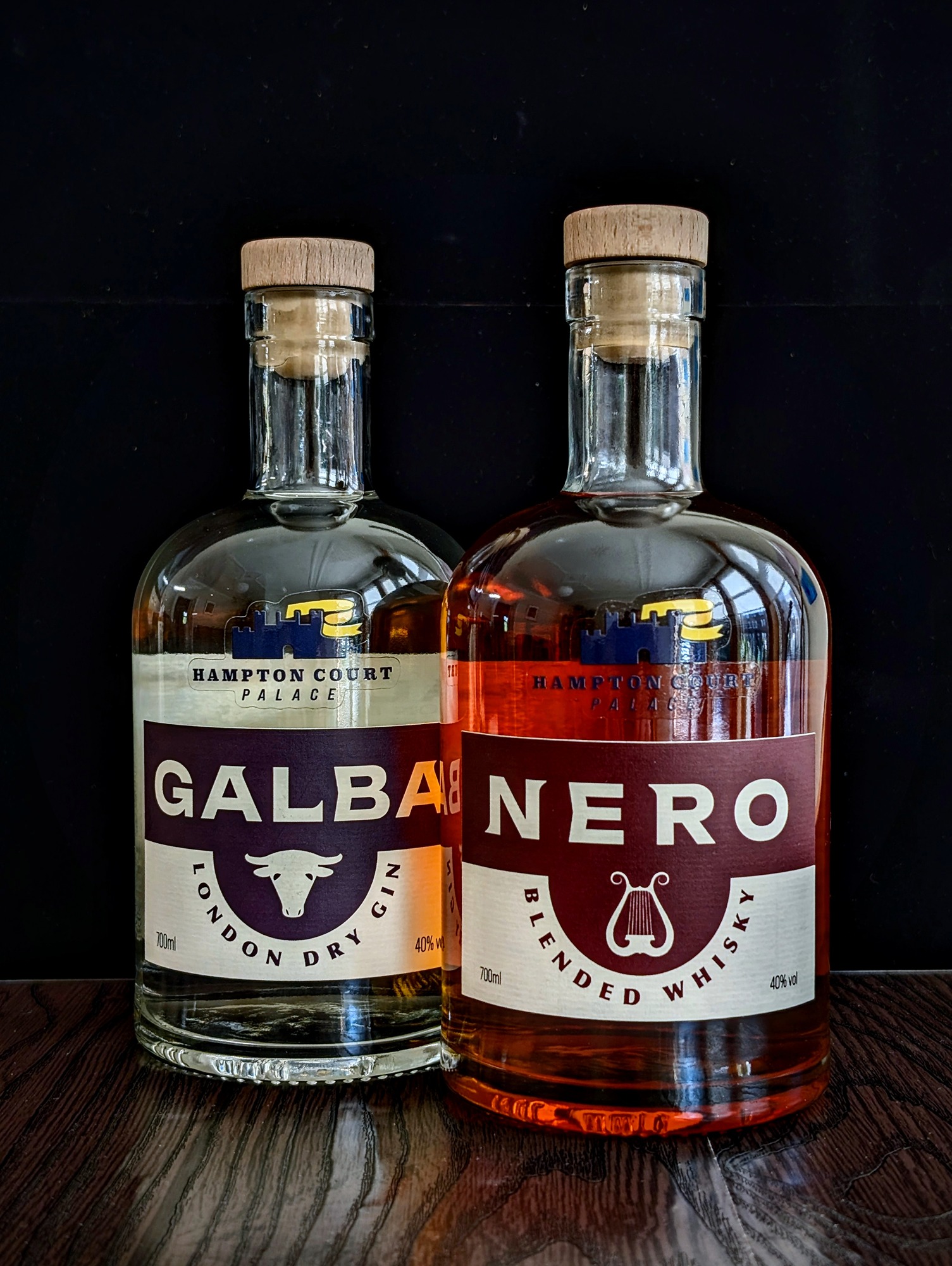 A pair of spirit bottles designed for Hampton Court Palace that includes a new logo for the estate. This project began with designing a new logo for the palace. It takes inspiration from the many tournaments held there by Henry VIII and other monarchs.