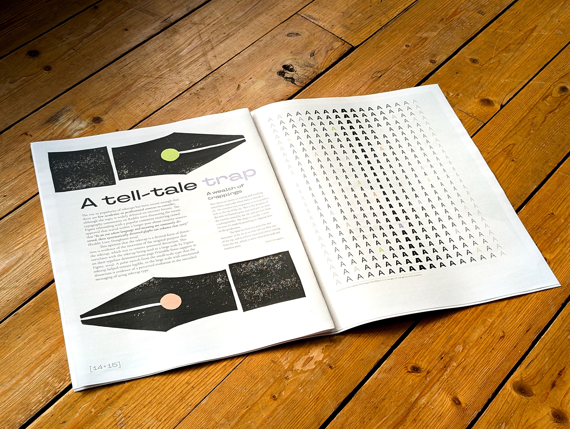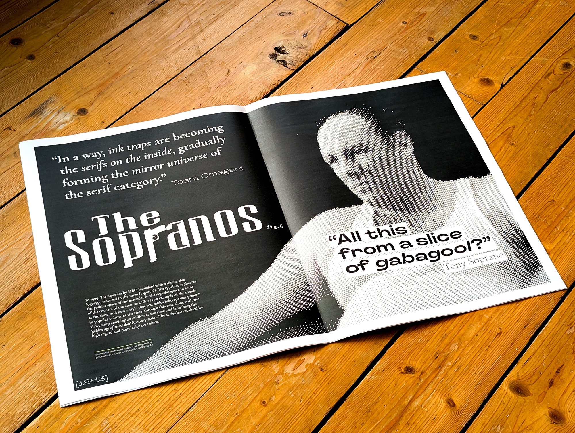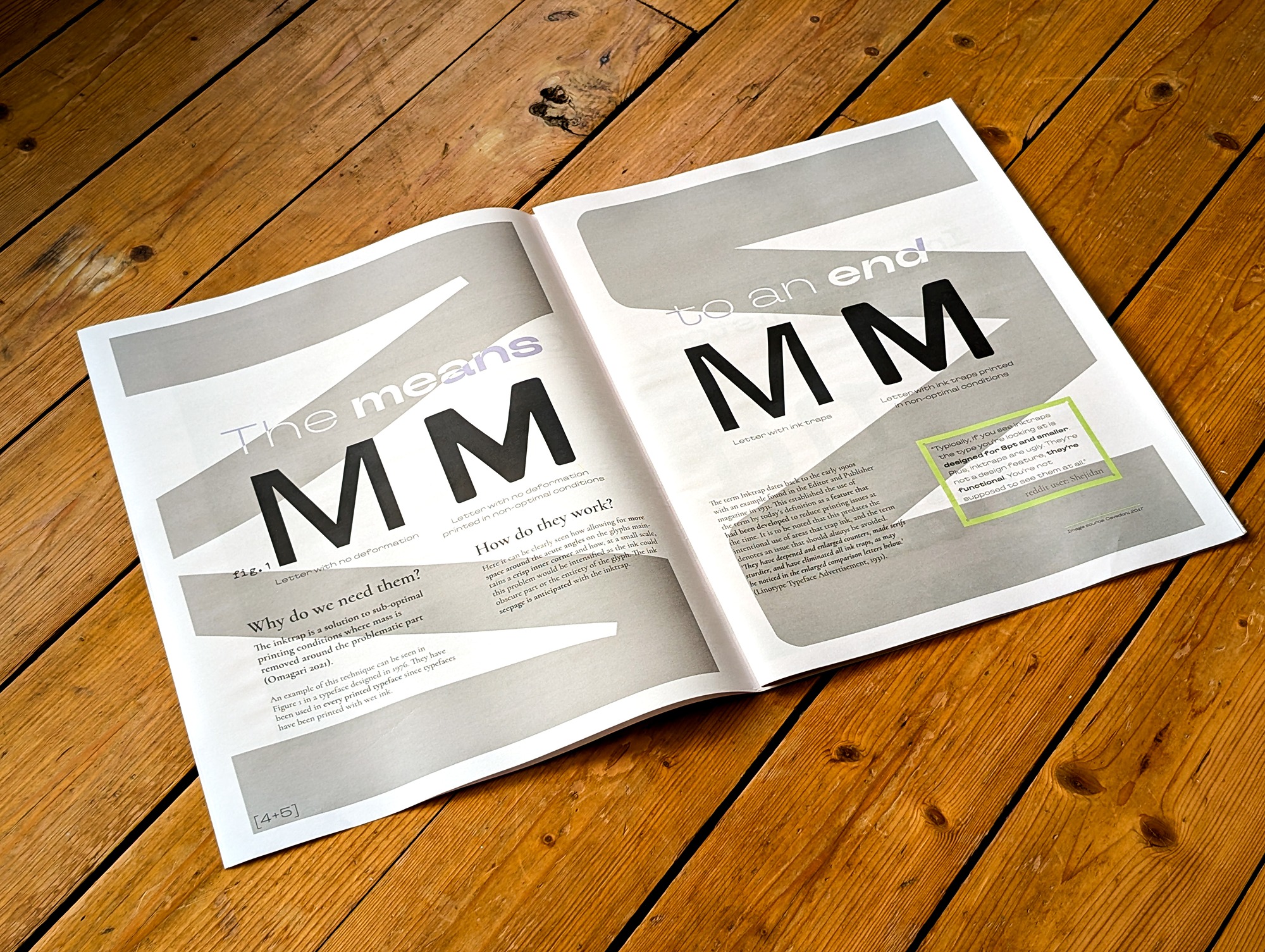 An editorial production of a dissertation that answers the question: 'Is ink trap type an evolutionary or vestigial aspect of typeface design', written by the studio lead. This work combines digital image manipulation and manual printing techniques to reflect its content.
